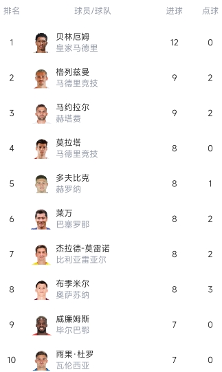 西甲射手榜:贝林厄姆12球0点独居榜首 格子9球第二、莱万8球第四