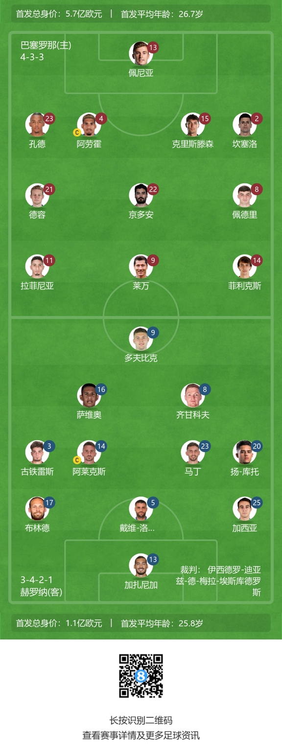 巴萨首发:1-佩尼亚、23-孔德、4-阿劳霍、15-克里斯滕森、2-坎塞洛、21-德容、22-京多安、8-佩德里、11-拉菲尼亚、14-菲利克斯、9-莱万