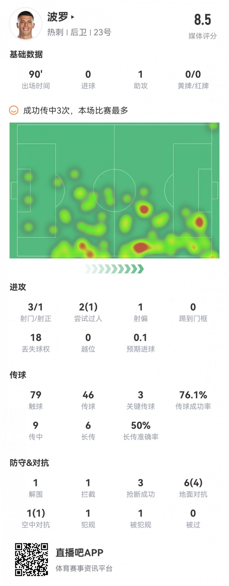 12月11日讯 热刺4-1大胜纽卡,右后卫波罗首发打满全场,贡献一次助攻。数据方面,波罗成功传中3次全场最多,3次关键传球!防守方面1解围1拦截3抢断,7次对抗5次成功,评