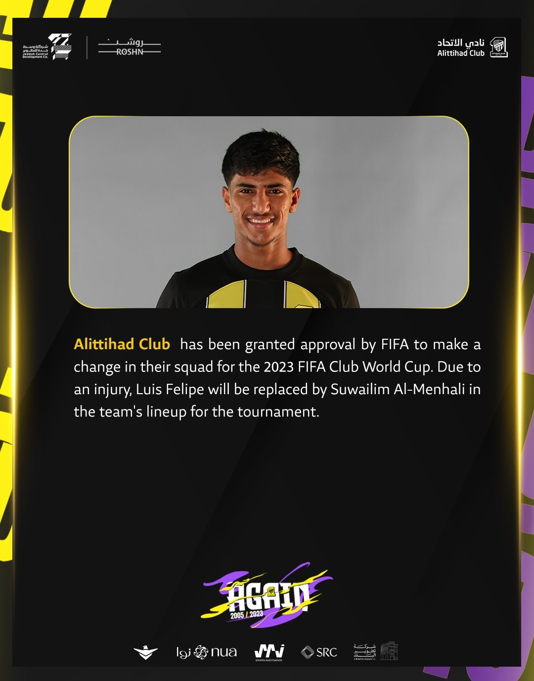 12月11日讯 吉达联合官方宣布,球队中后卫路易斯-费利佩因伤无缘世俱杯,另一名中后卫阿尔门哈里递补进入大名单。吉达联合更新世俱杯大名单:门将:1-马约夫、34-