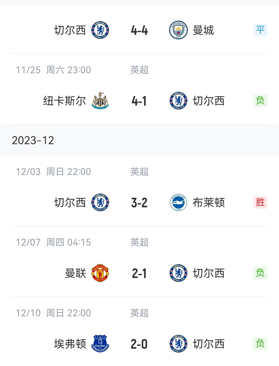 12月11日讯 英超第16轮,切尔西客场0-2埃弗顿,近5场英超1胜1平3负,目前在积分榜上积19分位列第12。切尔西近5场英超战绩:切尔西4-4曼城纽卡4-1切尔西切尔西3-2