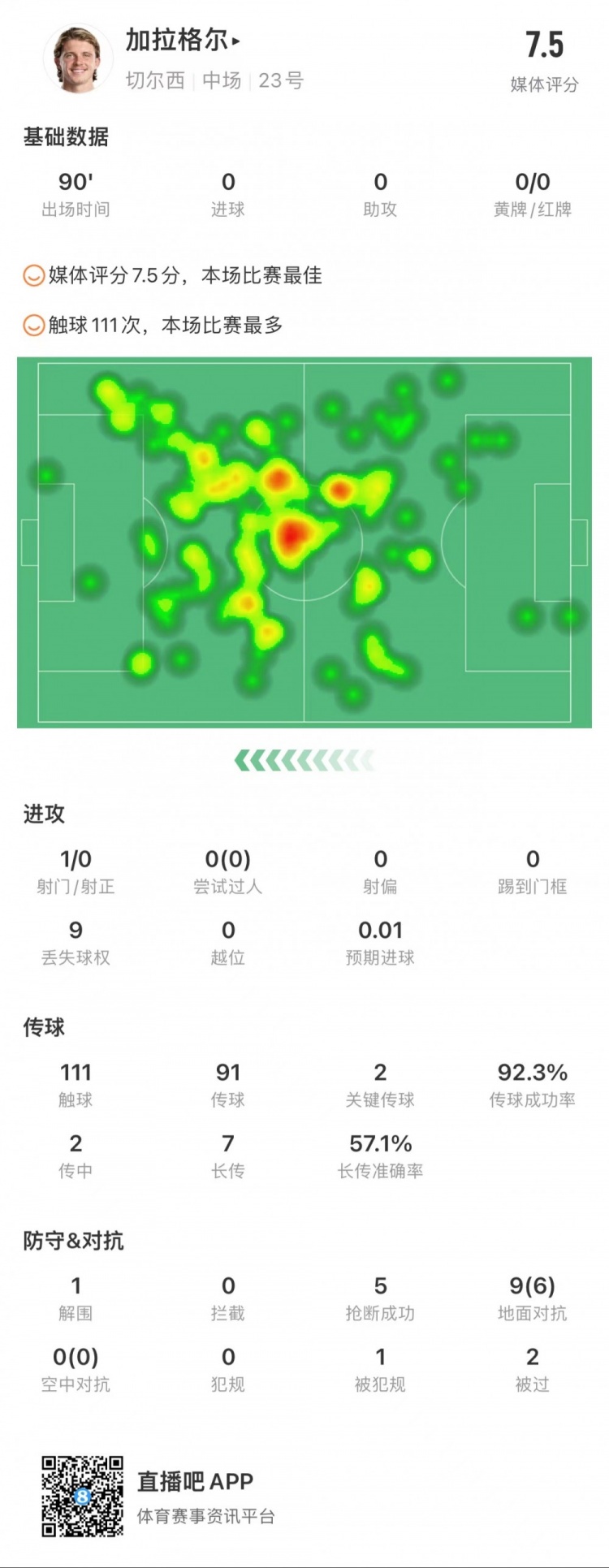加拉格尔全场数据:5次抢断,2次关键传球,评分7.5全场最高