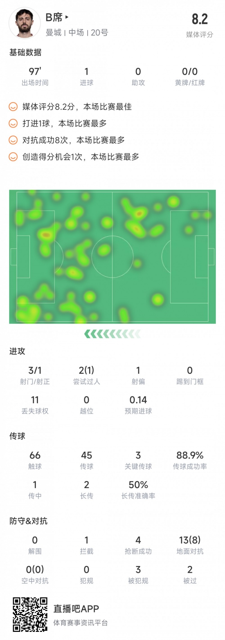 12月10日讯 英超联赛第16轮,曼城对阵卢顿,本场比赛B席首发出战,比赛第62分钟,B席打入一球帮助曼城扳平比分。以下为B席本场关键数据:评分:8.2射门:3次射正:1次射偏