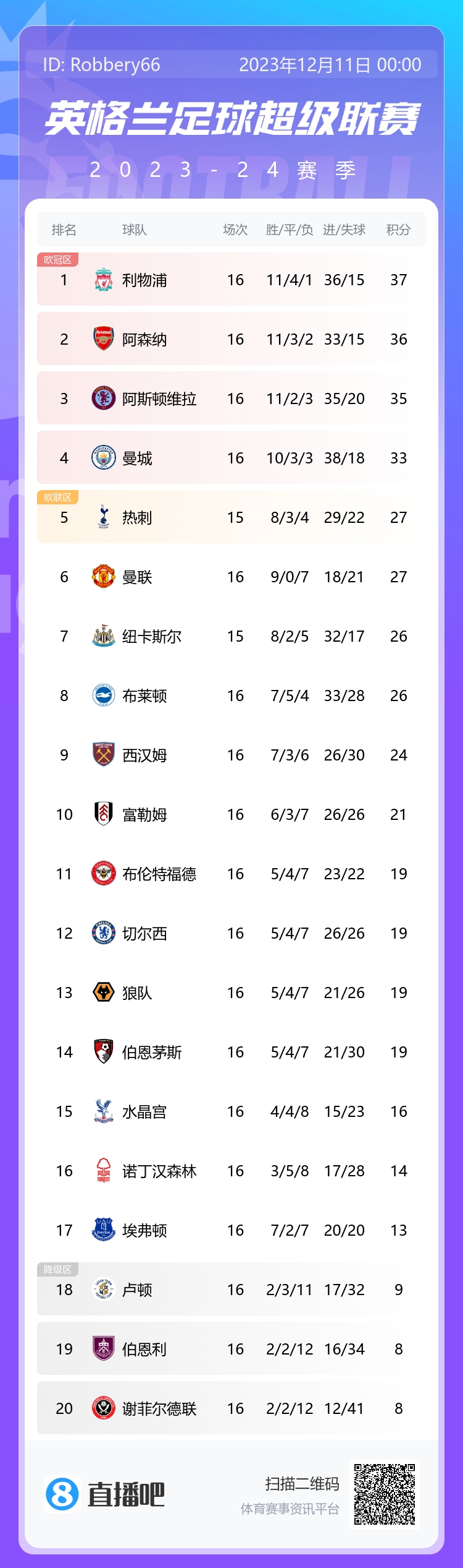 截止目前,在英超积分榜上切尔西被富勒姆、小蜜蜂反超,排名降至第12。曼城积33分仍居第4,距离榜首的利物浦4分。
