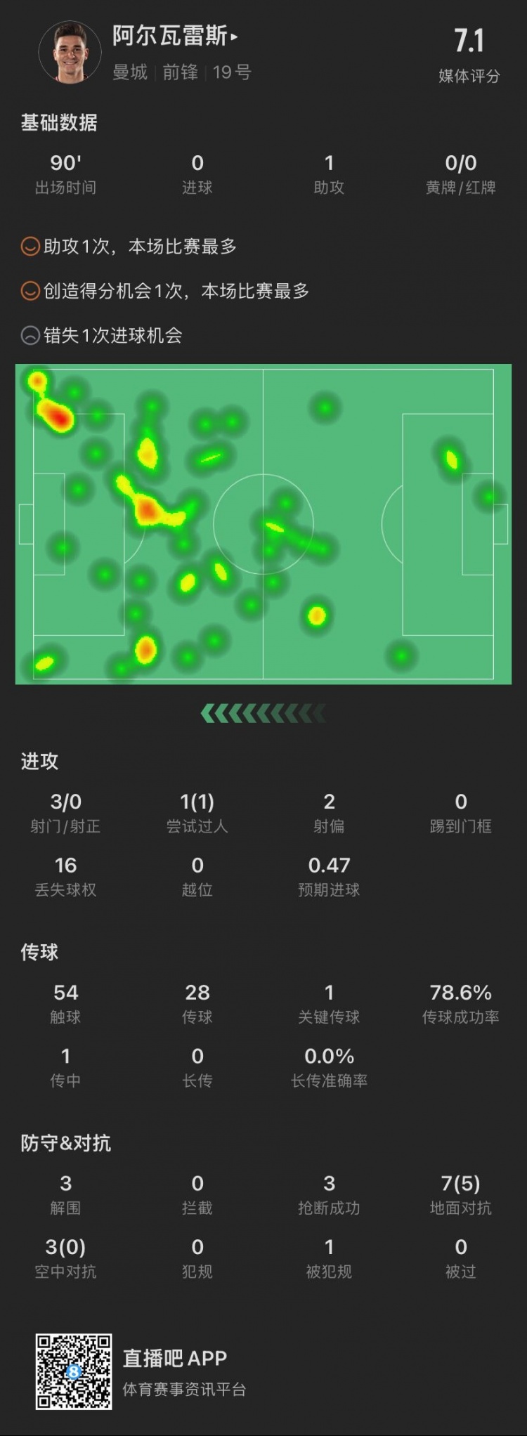 阿尔瓦雷斯全场数据↓