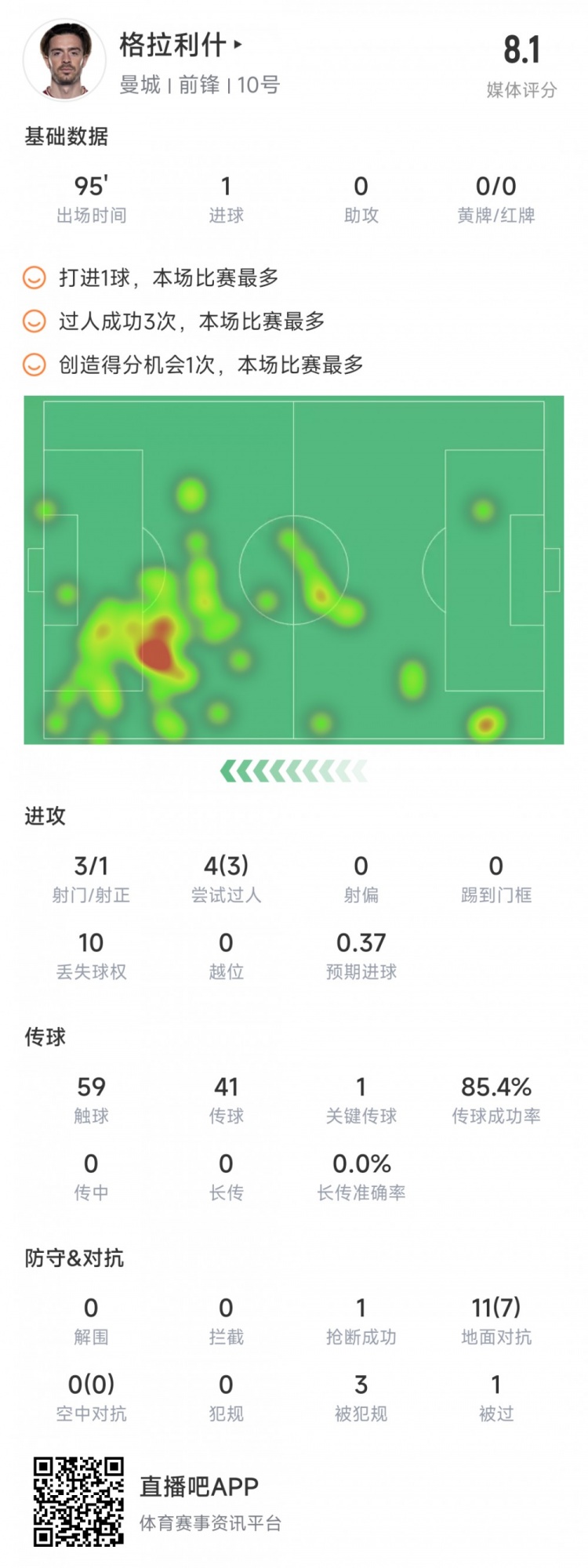 格拉利什本场数据:1个进球,1次创造良机,11次对抗7次成功