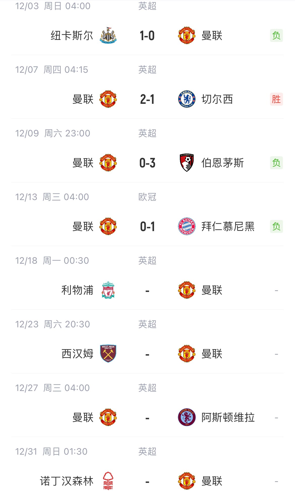 12月13日讯 曼联0-1不敌拜仁,小组垫底告别欧战,红魔12月开局糟糕。曼联12月已踢4场比赛,1胜3负且欧战出局。本月他们还有4场英超,下一轮就将对阵榜首利物浦。