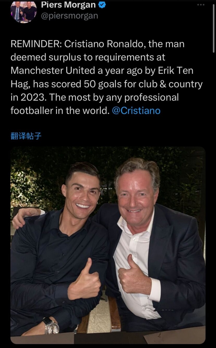 摩根晒出自己和C罗的合照,并写道:“提醒一下,一年前,滕哈赫认为C罗是曼联多余的球员。2023年,他已经为俱乐部和国家队打进了50粒进球,这是世界上所有职业球员里今年进球最多的人。”