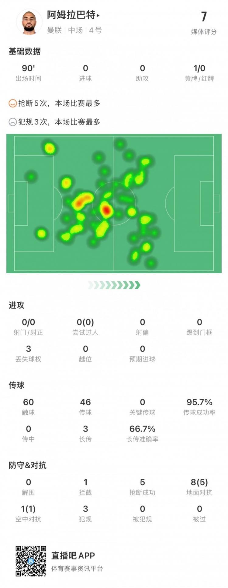 本场比赛,曼联中场阿姆拉巴特全场数据: