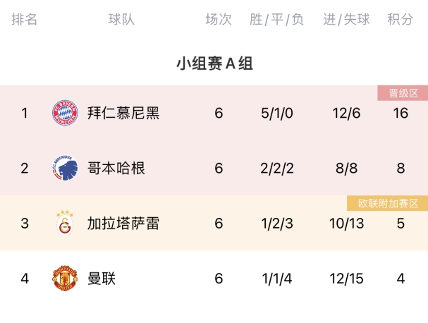 12月13日讯 欧冠A组第六轮战罢,曼联0-1不敌拜仁,哥本哈根1-0加拉塔萨雷,小组赛正式收官。