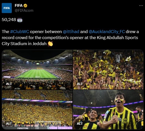 12月13日讯 国际足联官方消息,吉达联合vs奥克兰城的世俱杯比赛创造了赛事揭幕战上座纪录。今天凌晨,吉达联合在世俱杯中3-0击败奥克兰城,本场比赛有50248名球