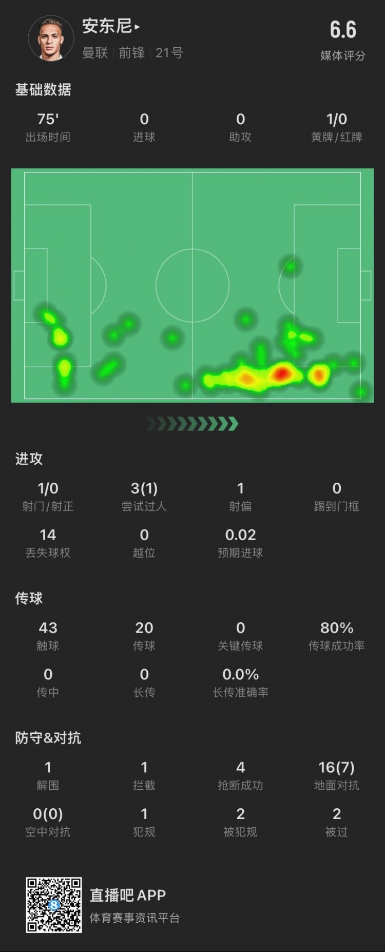 安东尼本场数据:3次过人成功1次,16次对抗成功7次,贡献4抢断