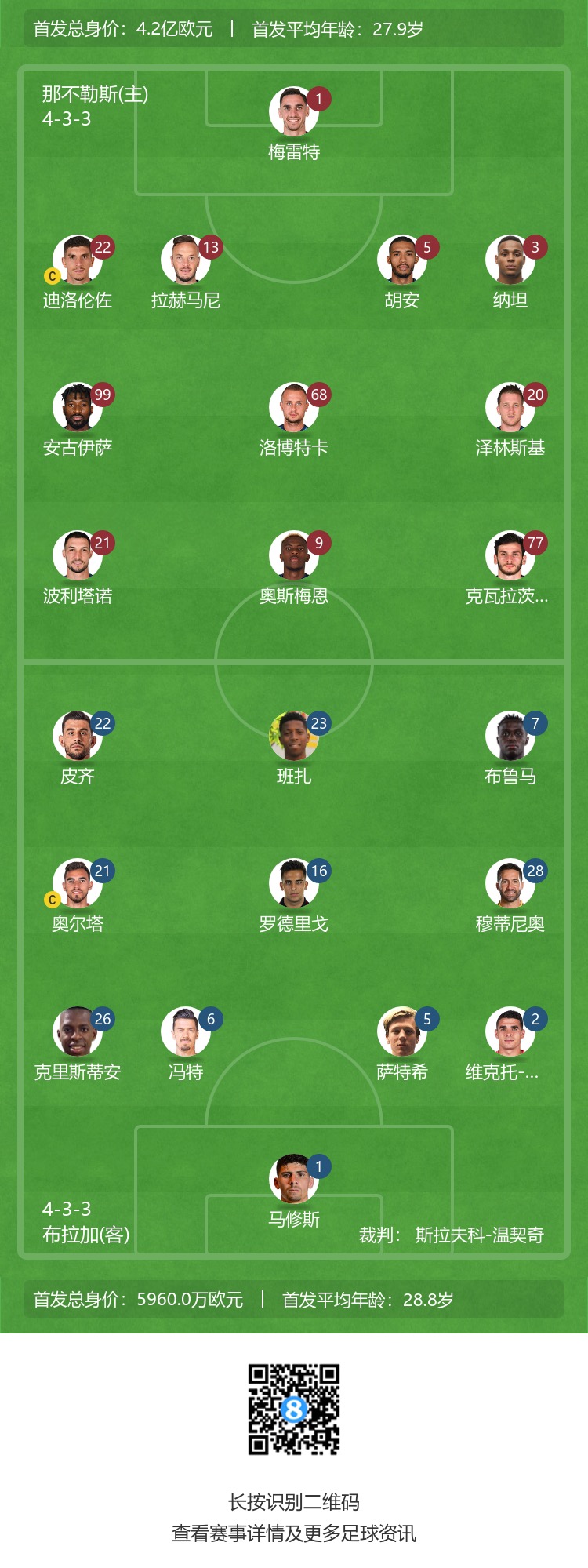 那不勒斯vs布拉加首发:奥斯梅恩、K77、波利塔诺先发