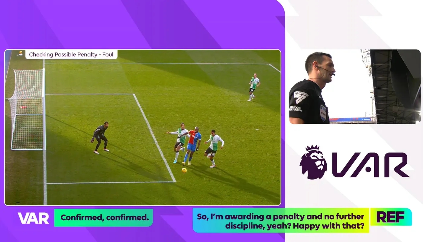 官方解释中说明了整个判罚过程:主裁马德利第一时间认为两名球员没有足够的接触,不足以判罚点球。比赛继续进行时,VAR对此进行了确认,并建议主裁到场边对他最初的判罚进行评估。主裁马德利改变了最初的判罚,给了水晶宫点球。