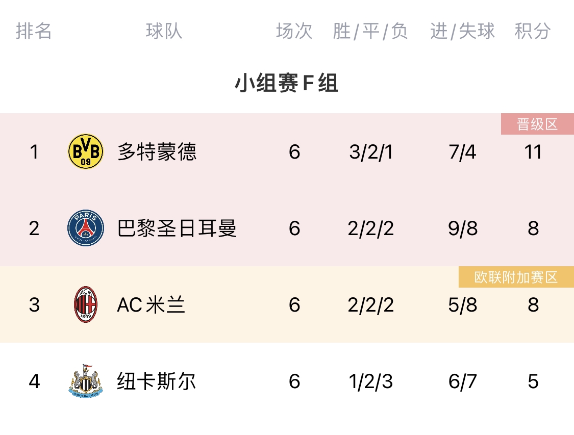 欧冠6轮小组赛全部结束,16强诞生。死亡之组F组中,多特和巴黎分别出线,米兰进欧联,纽卡垫底出局。