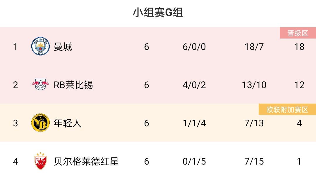 12月14日讯 欧冠G组第6轮,曼城客场3-2击败贝尔格莱德红星,六战全胜头名出线。