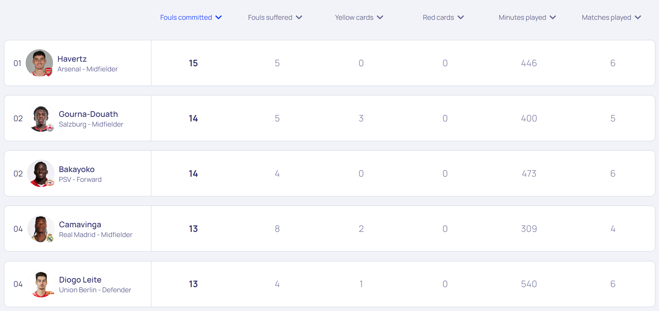 12月14日讯 欧冠小组赛落下帷幕,欧冠官方更新了小组赛犯规数据。哈弗茨6场狂砍15犯排名第一,但是精准拿捏尺度,没有吃到黄牌。