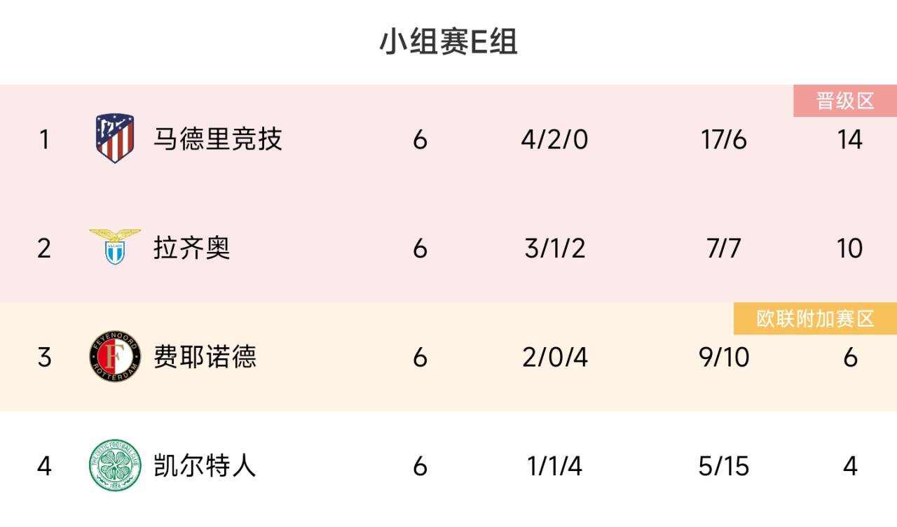 最终小组积分榜,马竞14分头名晋级,拉齐奥10分第二出线,费耶诺德6分第三进入欧联附加赛,凯尔特人4分垫底直接出局。