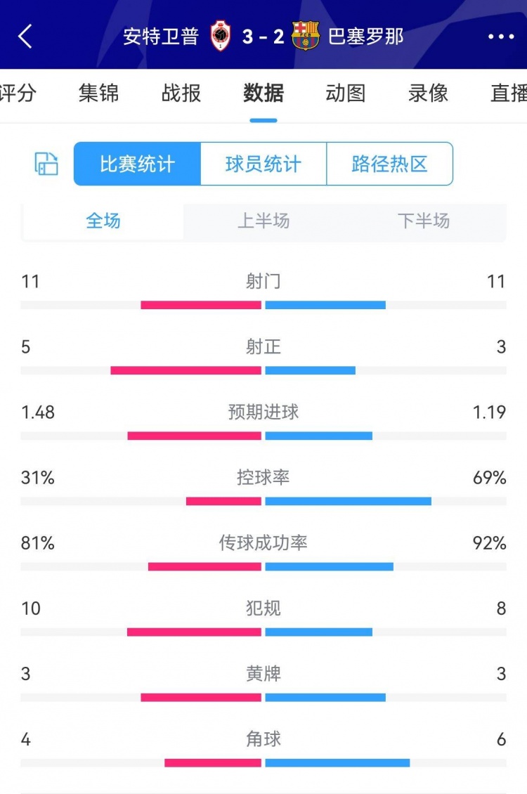 巴萨2-3安特卫普数据:射门11-11 射正3-5 控球率69%-31%领先