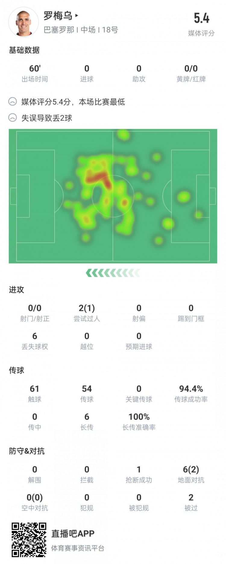 罗梅乌本场数据:6次丢失球权&2次失误导致丢球 评分5.4分