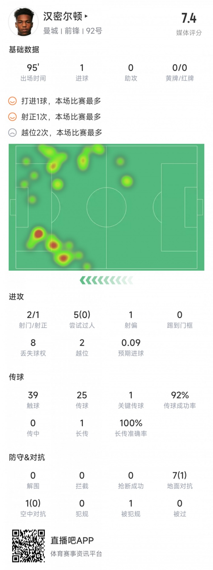 汉密尔顿首秀数据:首开记录+造点,1次关键传球,获评7.4分