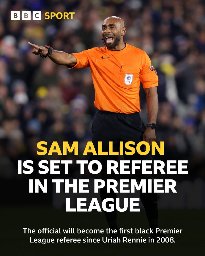 此外,萨姆·阿利森(Sam Allison)成为英超最近最近15年第一位黑人主裁判,他将执法下轮谢菲联vs卢顿。