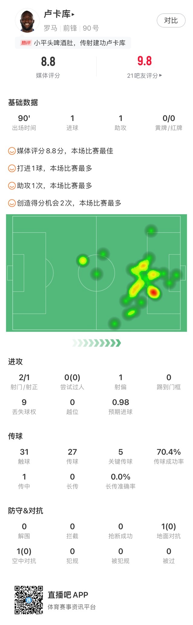 卢卡库本场数据如下: