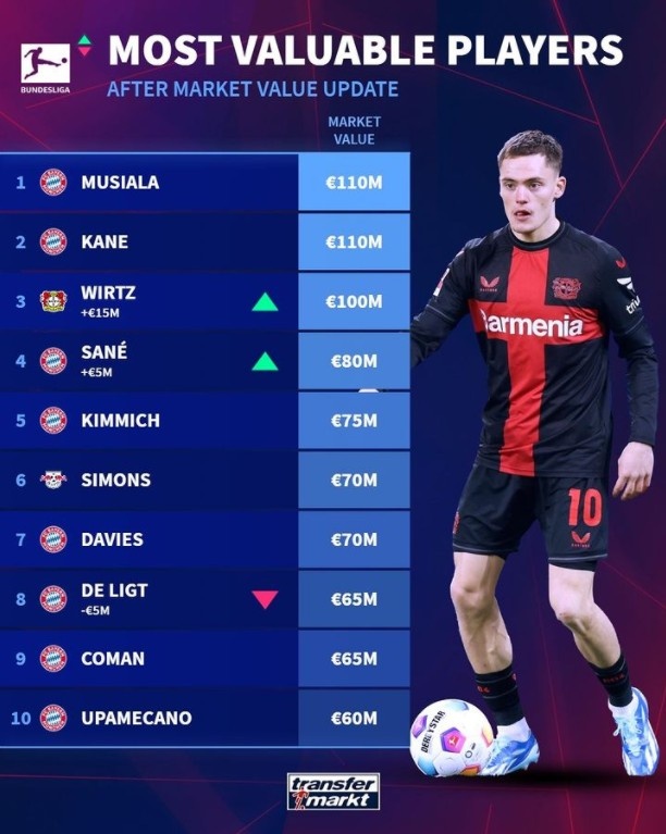 12月15日讯 德国转会市场网更新最新一期球员身价,德甲方面,穆西亚拉和凯恩1.1亿欧最高,勒沃库森球员维尔茨成为新晋亿元先生。