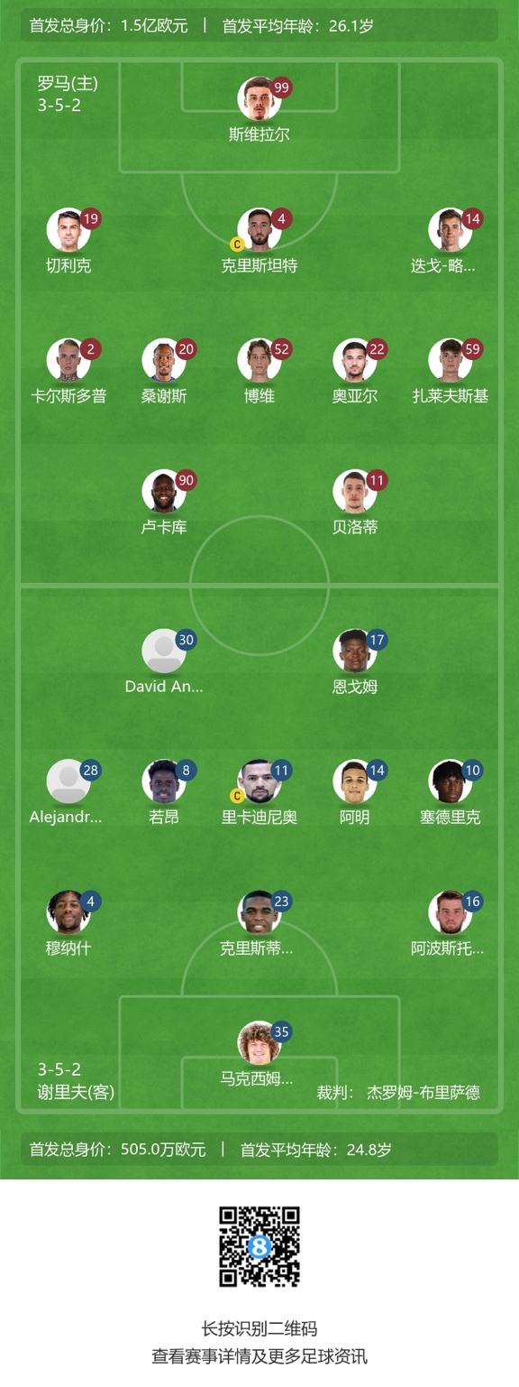 罗马首发:99-斯维拉尔、14-迭戈-略伦特、4-克里斯坦特、19-切利克、2-卡尔斯多普、20-雷纳托-桑谢斯、22-奥亚尔、52-博维、59-扎莱夫斯基、11-贝洛蒂、90-卢卡库