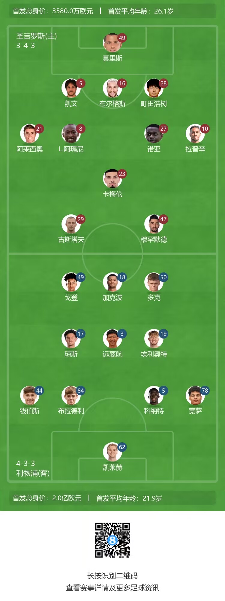 圣吉罗斯首发:49-莫里斯、5-凯文-麦卡利斯特、16-伯吉斯、28-町田浩树、21-蒙泰斯、8-阿马尼、27-萨迪基、10-拉普辛、23-普埃尔塔斯、29-尼尔森、47-阿穆拉