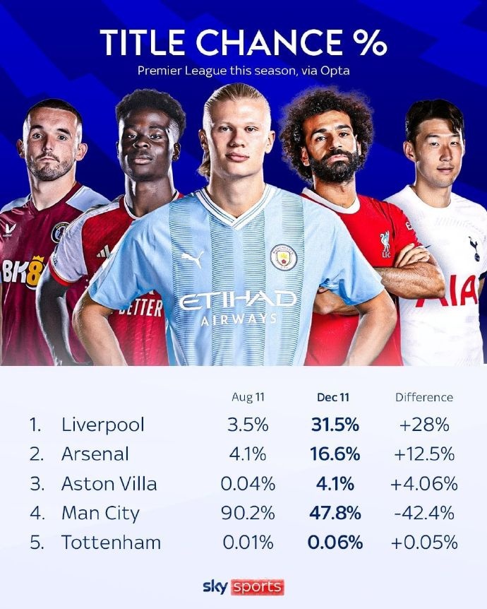 12月14日讯 天空体育刚刚将赛季前的英超各队夺冠概率与当前概率进行了对比,曼城大幅度下降,但仍然领跑。利物浦夺冠概率则大幅度上升。