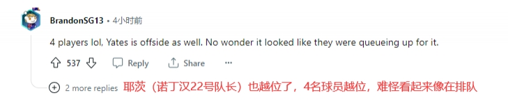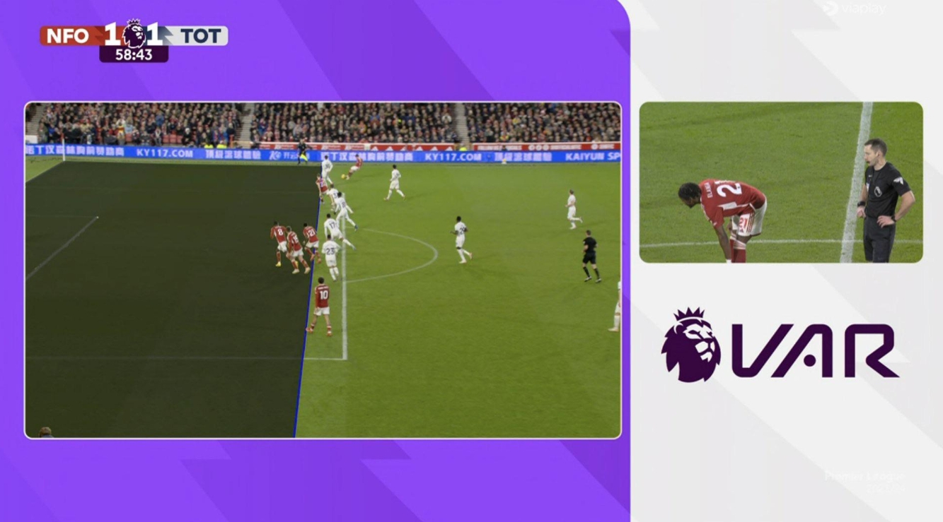 这粒明显的越位进球引发了球迷的热议,原因是VAR介入后反复检查了1分钟。最终进球越位无效,比分回归诺丁汉森林0-1热刺。