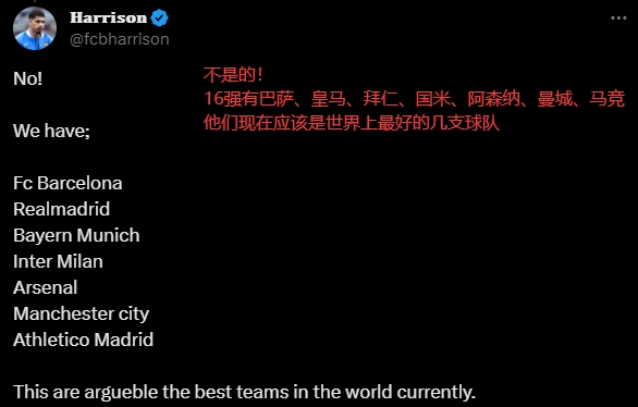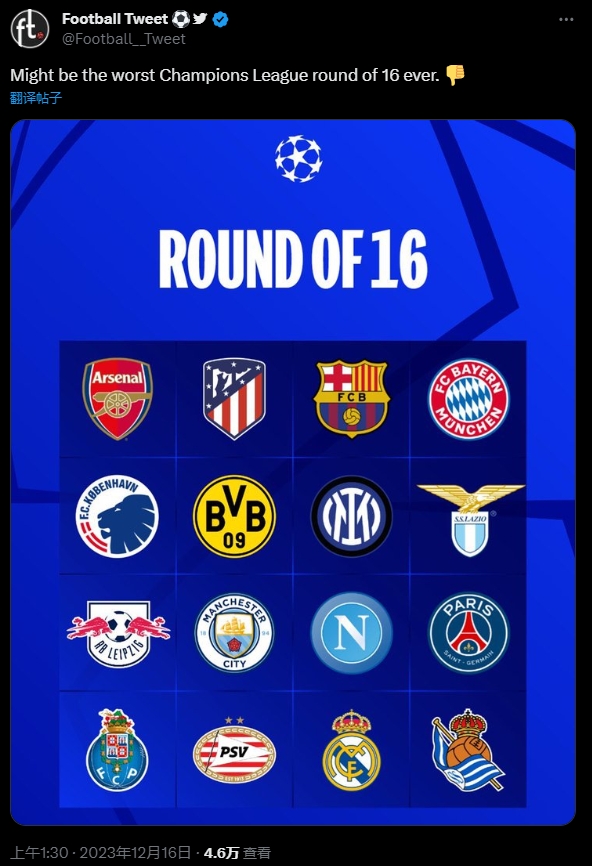 欧冠小组赛已全部战罢,16强也悉数出炉,足球资讯博主Football Tweet在社媒上吐槽称,这届欧冠16强可能是欧冠史上最糟的16强。这一言论也遭到了球迷们的吐槽。