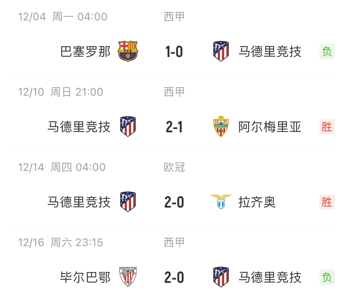 12月17日讯 本轮西甲,马竞0-2不敌毕尔巴鄂,本赛季联赛已输4场。