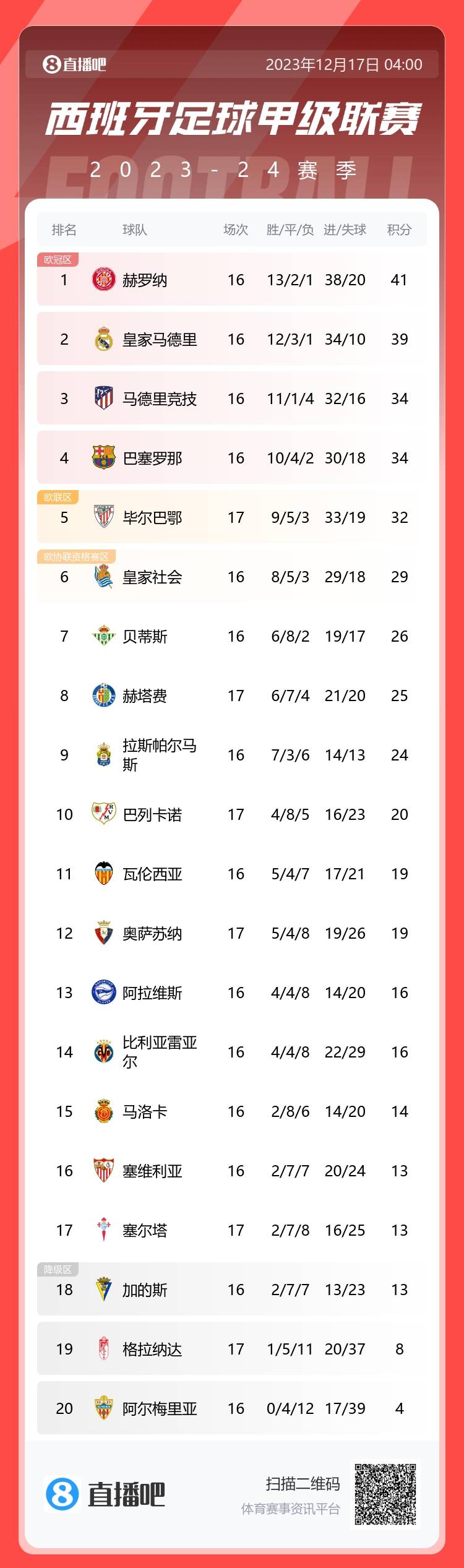 目前,塞维利亚在西甲2胜7平7负积13分,位居积分榜第16位,与降级区同分。同时,塞维利亚在欧冠赛场也垫底出局。