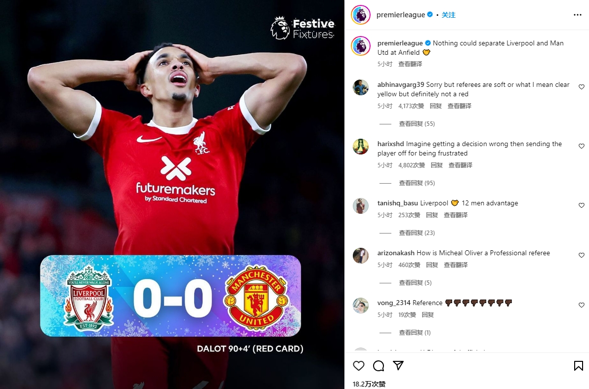 奥利弗这次判罚引发争议,赛后,有球迷涌入英超官方的ins战报下表达愤怒和不满。