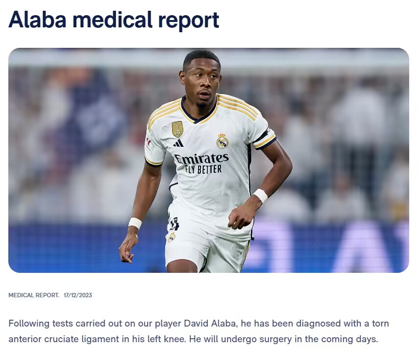 12月18日讯 皇马官方消息,阿拉巴左膝前十字韧带撕裂,未来几天将手术。TA的皇马跟队记者Mario Cortegana报道,阿拉巴将伤缺约8个月,赛季报销且无缘2024欧洲杯。