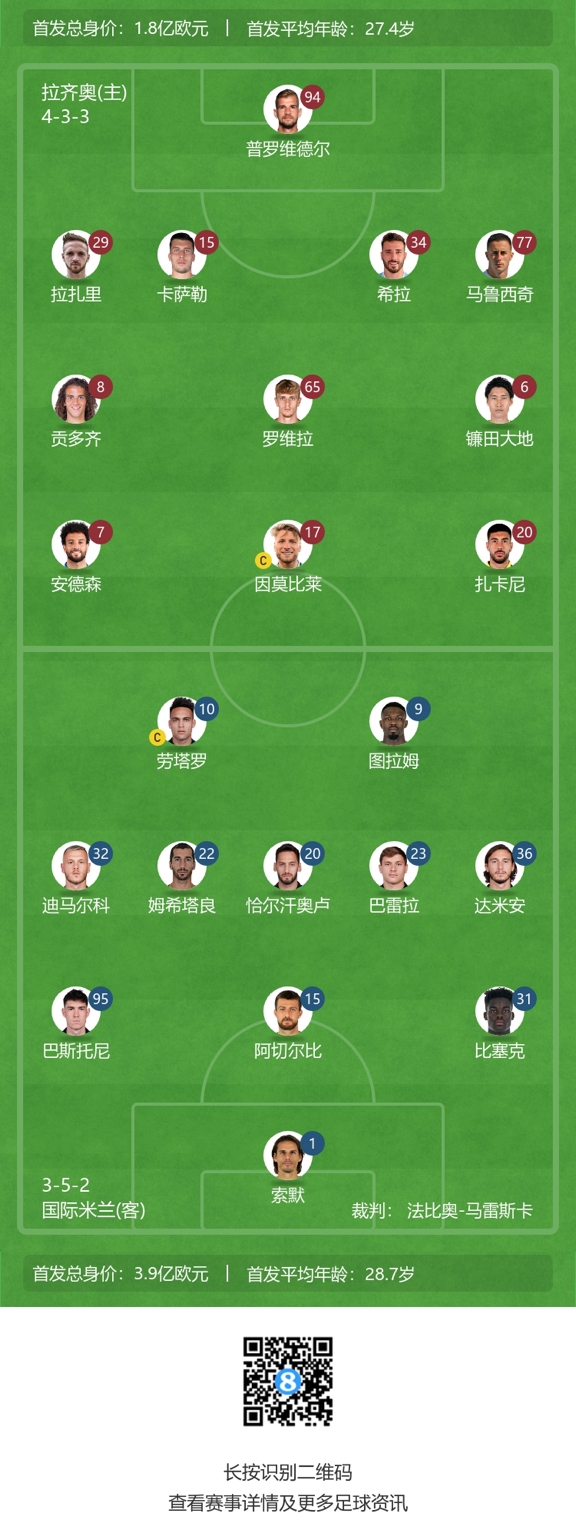 拉齐奥首发:94-普罗维德尔、29-拉扎里、19-卡萨勒、34-吉拉、77-马鲁西奇、8-贡多齐、69-罗维拉、8-镰田大地、7-费利佩-安德森、17-因莫比莱、20-扎卡尼