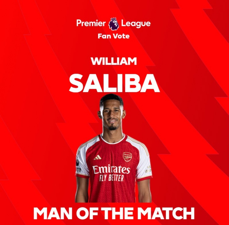 英超官方:萨利巴当选阿森纳2-0布莱顿全场最佳球员