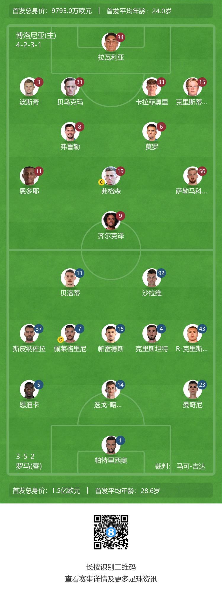12月18日讯 意甲第16轮,博洛尼亚迎战罗马比赛即将打响。赛前首发出炉。