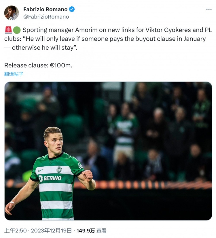 雅各布斯指出,吉奥克雷斯在切尔西的引援备选名单中,但葡萄牙体育主帅阿莫林对董事会明确表示,他不想在赛季中期失去这位25岁的瑞典中锋。如果切尔西希望在明年1月签下吉奥克雷斯,他们将面临另一场恩佐-费尔南德斯式的“战斗”,不得不支付球员合同中1亿欧元的解约金。