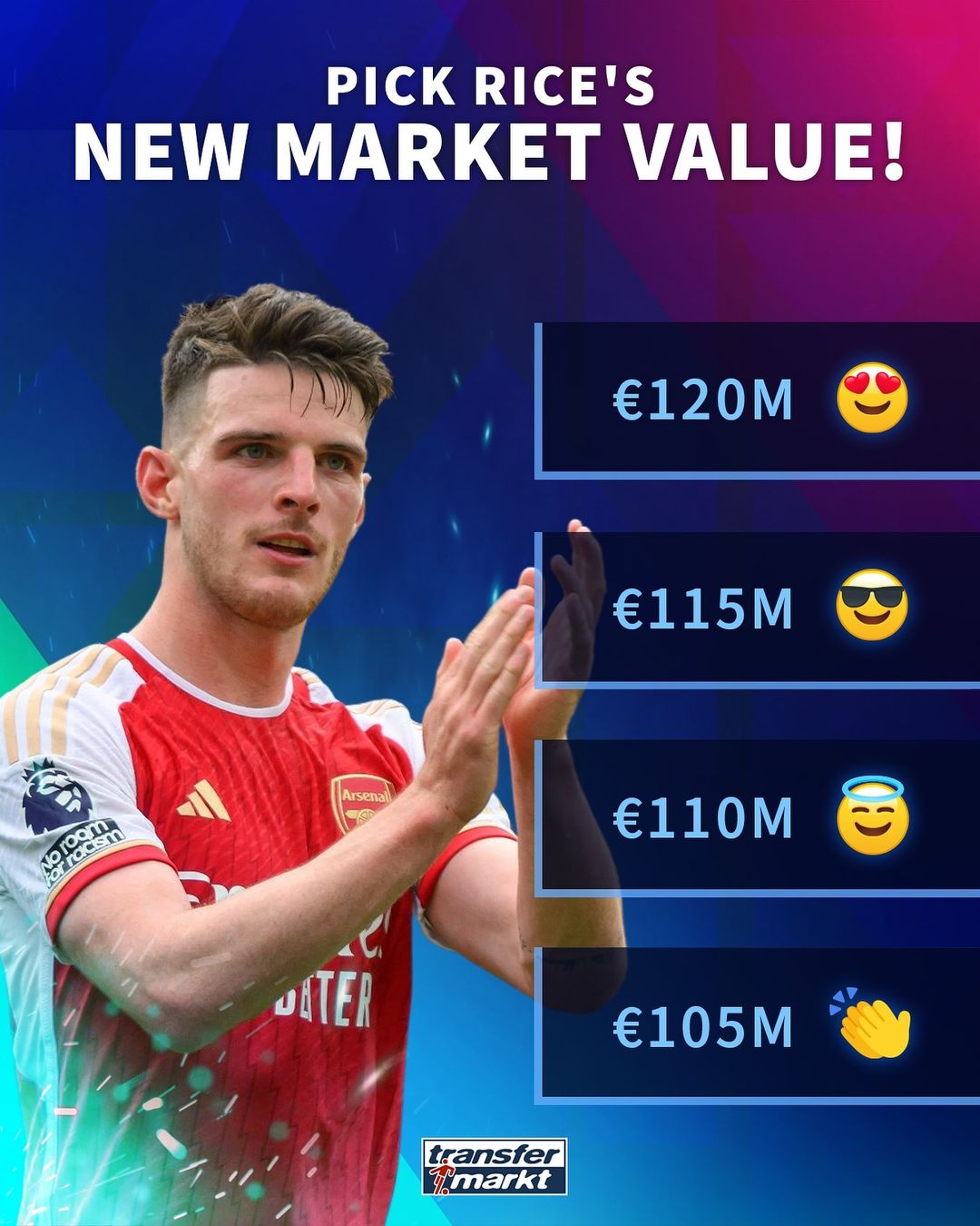 赖斯现有的德转估值为1亿欧。根据德转数据,赖斯今夏以1.16亿欧的金额转会阿森纳,本赛季,他代表阿森纳各赛事已经出场25次,另有3球2助攻入账。