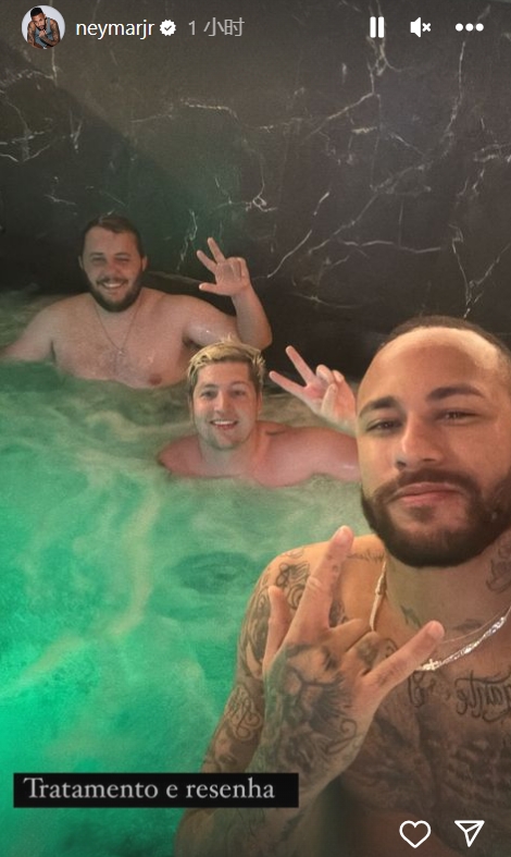 就在刚刚,内马尔本人在社媒晒出照片,自己和友人在泡澡、喝饮料看电视。