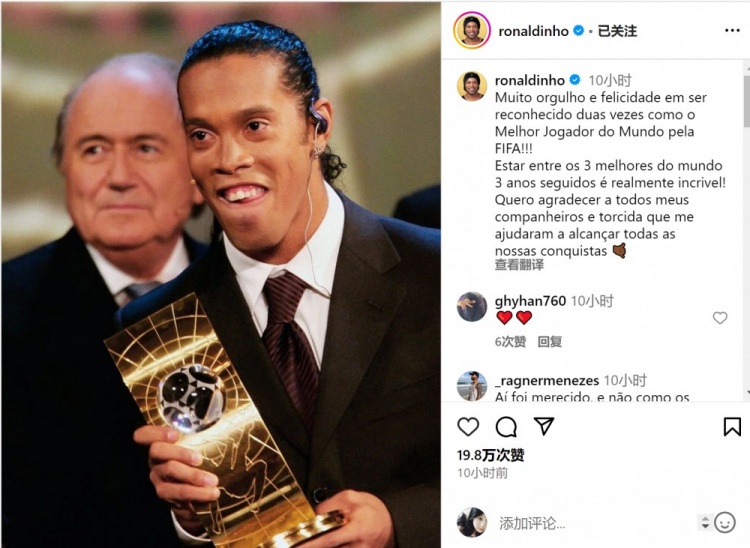 罗纳尔迪尼奥2004年、2005年连续当选世界足球先生,他在社交媒体上晒出领奖照片,并写道:“能够两次被国际足联评为世界最佳球员,我感到非常自豪和高兴!连续三年跻身世界前三,这真的太不可思议了!”