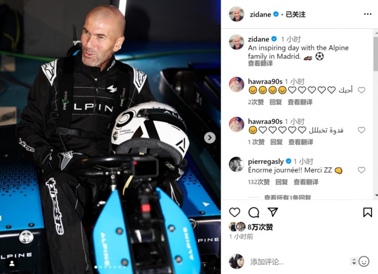 齐达内在社交媒体上晒出身穿赛车服的照片,并配文:“与阿尔卑大家庭(F1车队)在马德里共度鼓舞人心的一天。”
