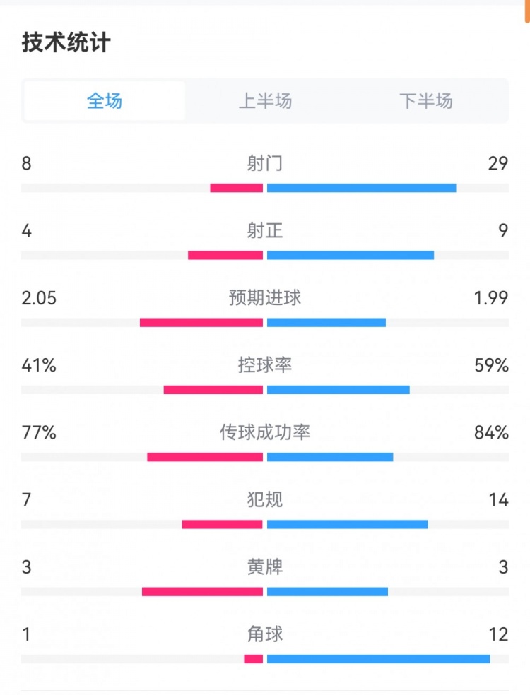 12月20日讯 本轮西甲,十人马竞主场3-3赫塔费。双方全场数据对比如下(马竞在前)↓射门8-29射正4-9预期进球2.05-1.99控球率41%-59%传球成功率77%-84%犯规7-14