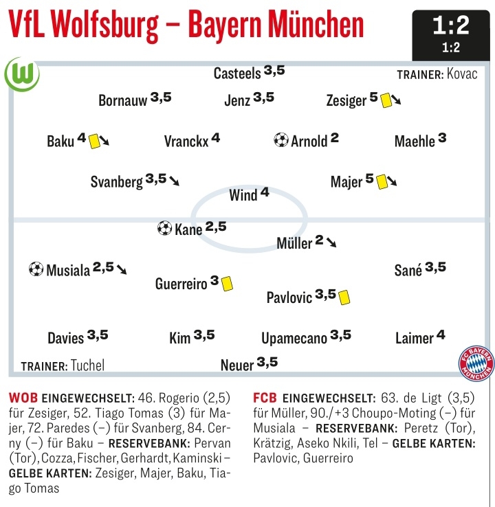 12月21日讯 在德甲第16轮比赛中,拜仁客场2比1击败沃尔夫斯堡,《踢球者》对两队球员进行了评分,穆勒、马克西米利安-阿诺德2分全场最高,凯恩、穆西亚拉2.5分。