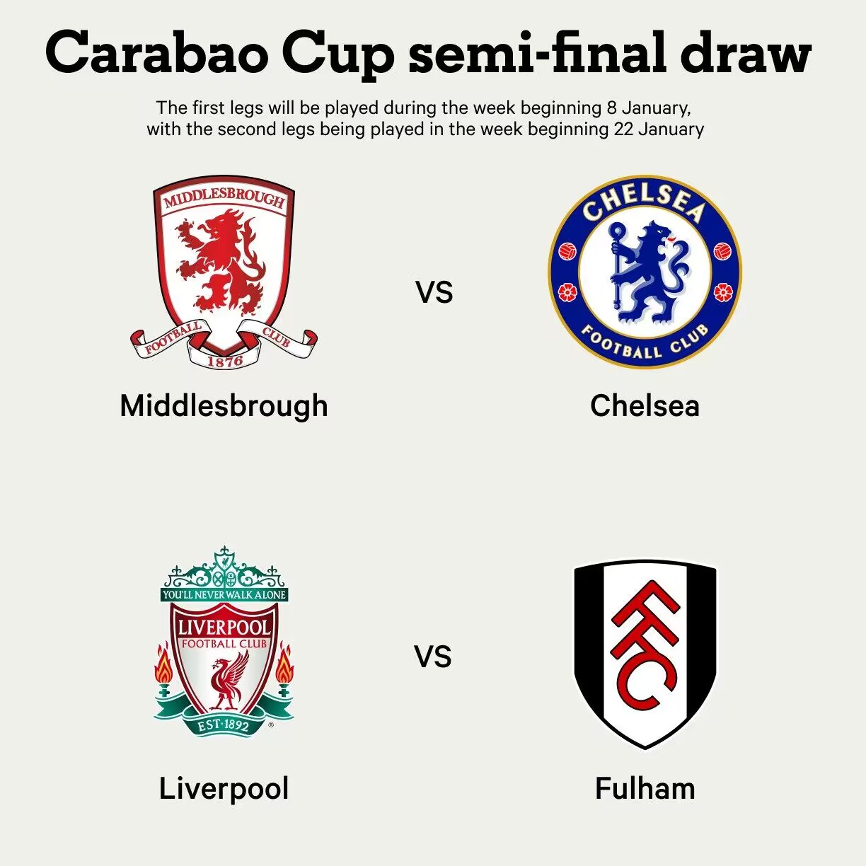 12月21日讯 联赛杯8强阶段对阵全部结束,四强抽签出炉,结果如下。米德尔斯堡vs切尔西利物浦vs富勒姆四强的首回合比赛将安排在1月8日后的一周内进行,次回合将