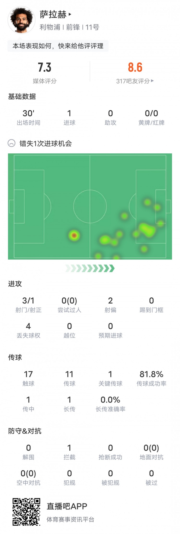 萨拉赫本场对阵西汉姆数据:1进球1错失重要机会,评分7.3