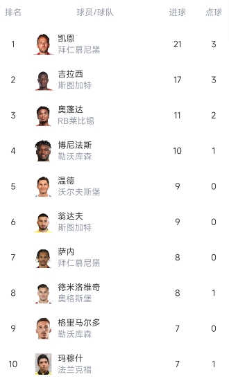 射手榜方面,凯恩21球高居榜首,吉拉西17球第二,奥蓬达11球第三。
